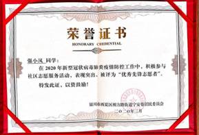 疫情发生以来,学院2017级财政学二班学生强小凤积极响应校团委以及院党委的号召,投身于银川市西夏区朔方路街道宁安巷居民委员会的疫情防控工作,真诚奉献、不辞辛劳,得到了当地居委会的肯定与鼓励。