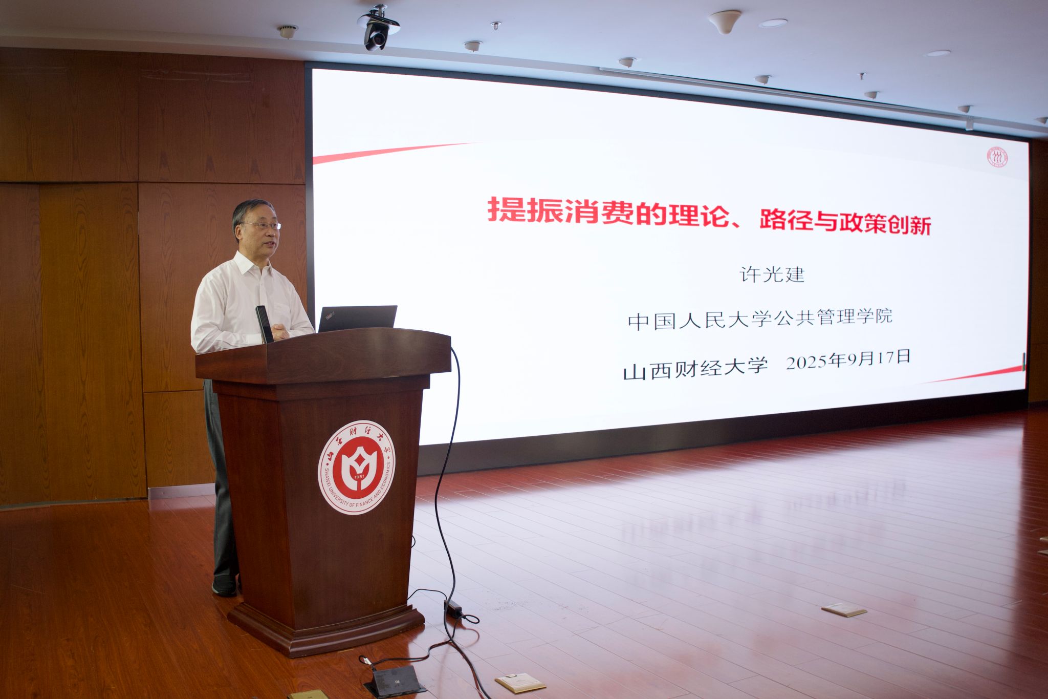 9月17日下午,OK138太阳集团名家讲堂在图书馆东馆一层报告厅成功举行。中国人民大学公共管理学院公共政策系教授、博士生导师许光建受邀作了以“提振消费的理论、路径与政策创新”为主题的学术讲座。许光建教授兼任中国价格协会副会长、中国宏观经济学会常务理事、中国市场监管学会常务理事等职务,曾任人大公共管理学院常务副院长等职。长期从事宏观经济理论与政策、财政理论与政策、价格理论和价格政策等相关研究,是国务院政府特殊津贴获得者,也是我校1977级计划统计专业的校友。校党委常委、副校长米子川教授主持本次讲座,学院教师与部分研究生参加讲座。